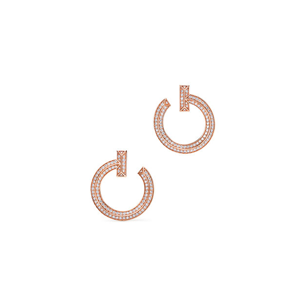 Tiffany t is an expression of love’s endless potential. Inspired by an archival bracelet from 1975, t is an homage to the house’s iconic motif and the spirit of new york, which founder charles lewis tiffany regarded as the place of promise and possibilities. Rows of striking diamonds illuminate the bold design of these open hoop earrings. Mix and match these distinctive hoops with delicate studs or other tiffany diamond earrings for a striking look that's sure to turn heads.