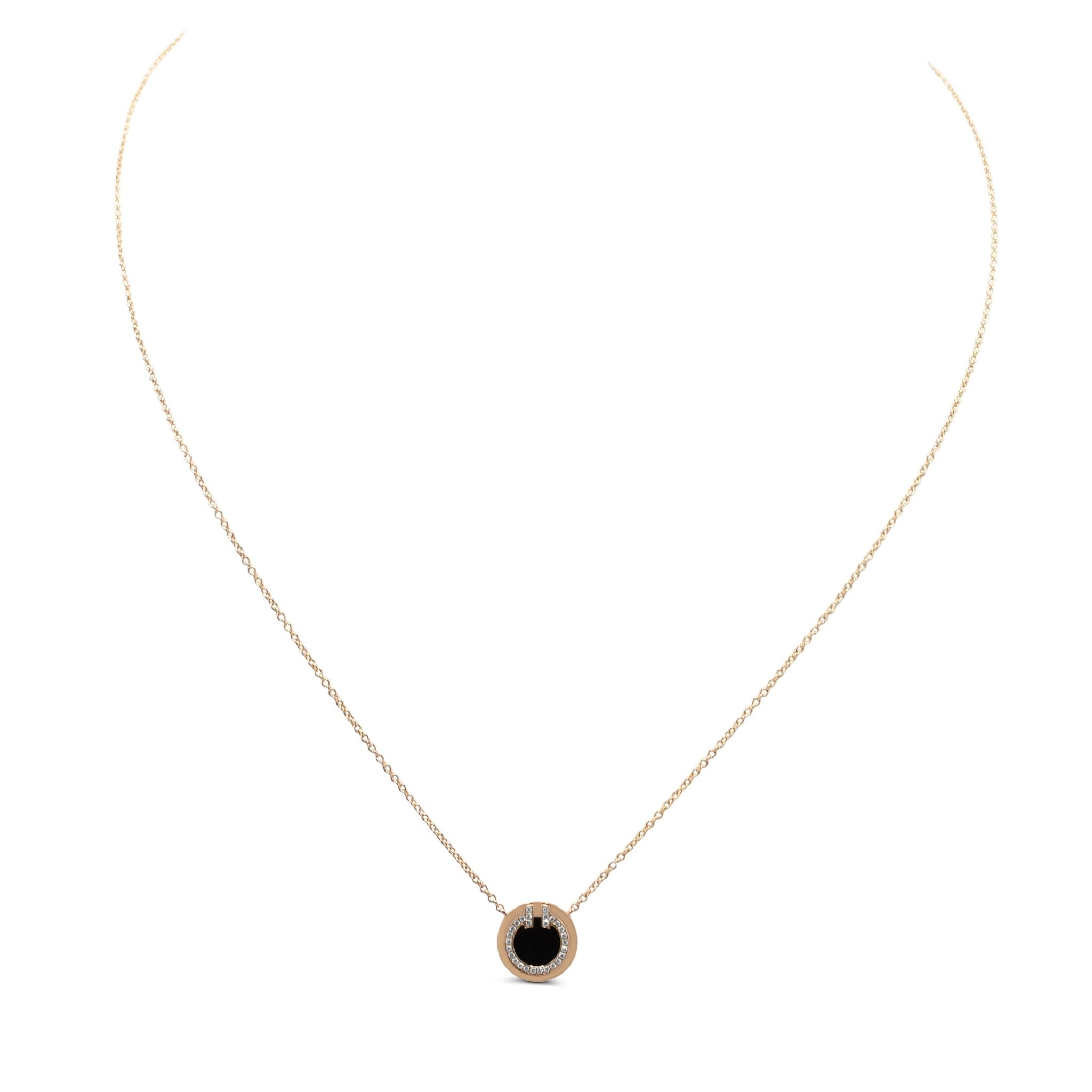 Introducing the ultimate symbol of sophistication and grace - this second hand Tiffany T Diamond & Onyx Circle Pendant Necklace. Crafted with 18ct Rose Gold and adorned with dazzling Diamonds and striking Onyx Gemstones, this necklace exudes timeless elegance and contemporary style.