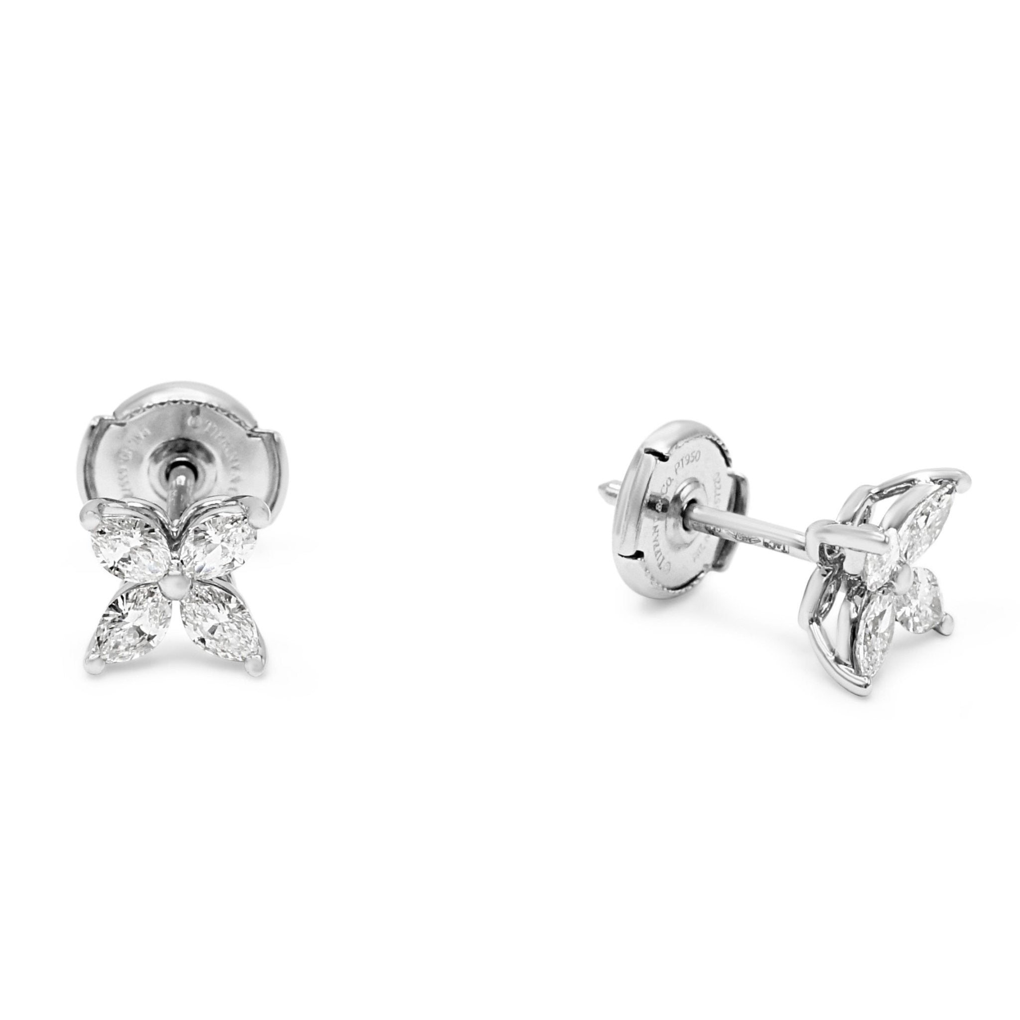 Experience the elegance and luxury of these pre-loved Tiffany Victoria Marquise Diamond Earrings. Add a touch of glamour and sophistication to your wardrobe with this timeless piece. The perfect gift for yourself or a loved one, these earrings are guaranteed to make a lasting impression. Make a statement with these used Tiffany Victoria Marquise Diamond Earrings in small size.