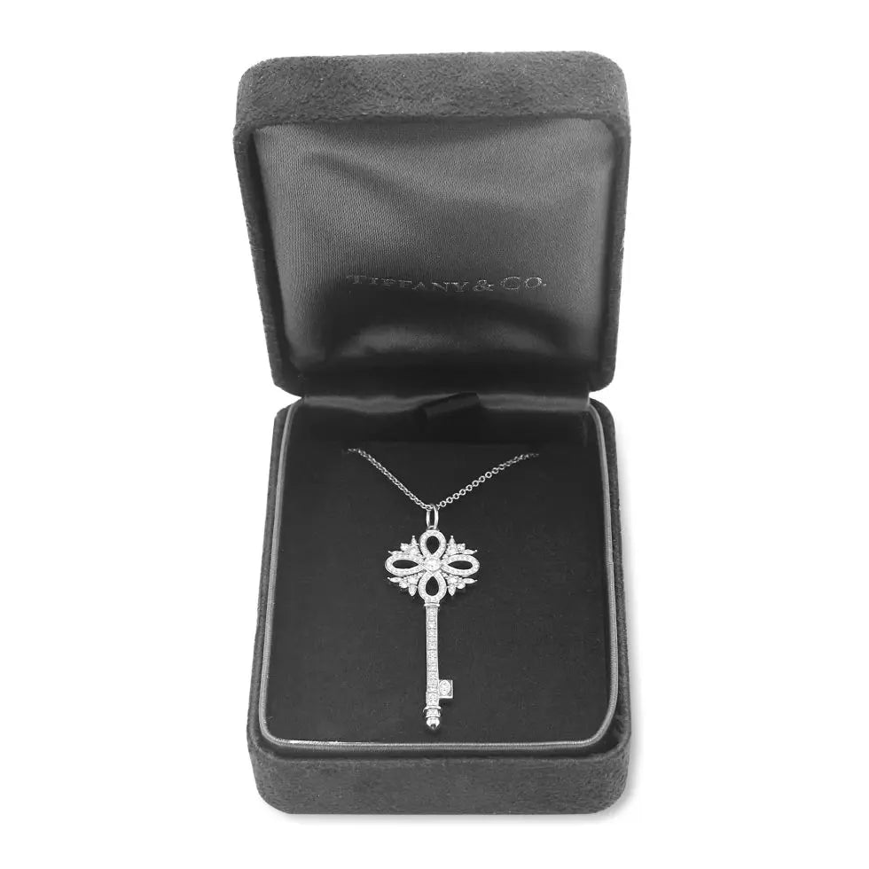 Introduce a timeless and elegant diamond key pendant on a necklace with Tiffany & Co's Victoria Jewelry Collection. Crafted from the finest Platinum material, this beautiful piece features a single 0.34ct round brilliant cut diamond set in the key pendant. The necklace length is 20" long, making a great accessory to match any outfit and suitable for day and night.