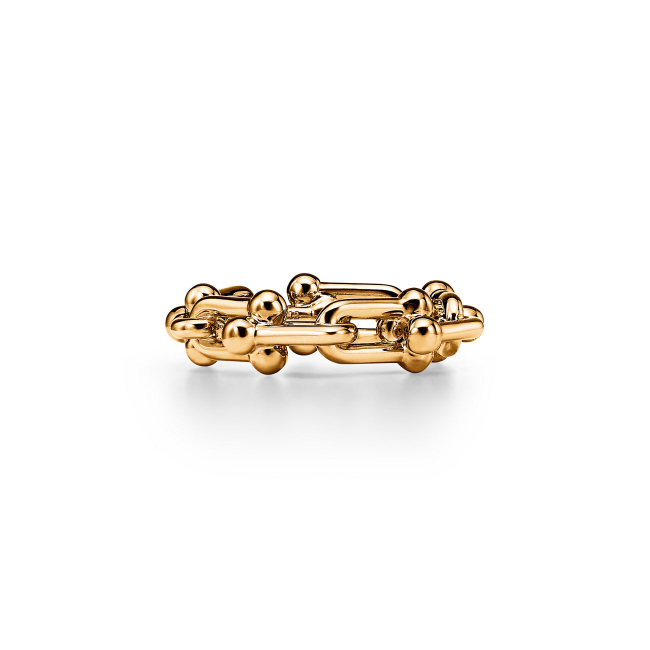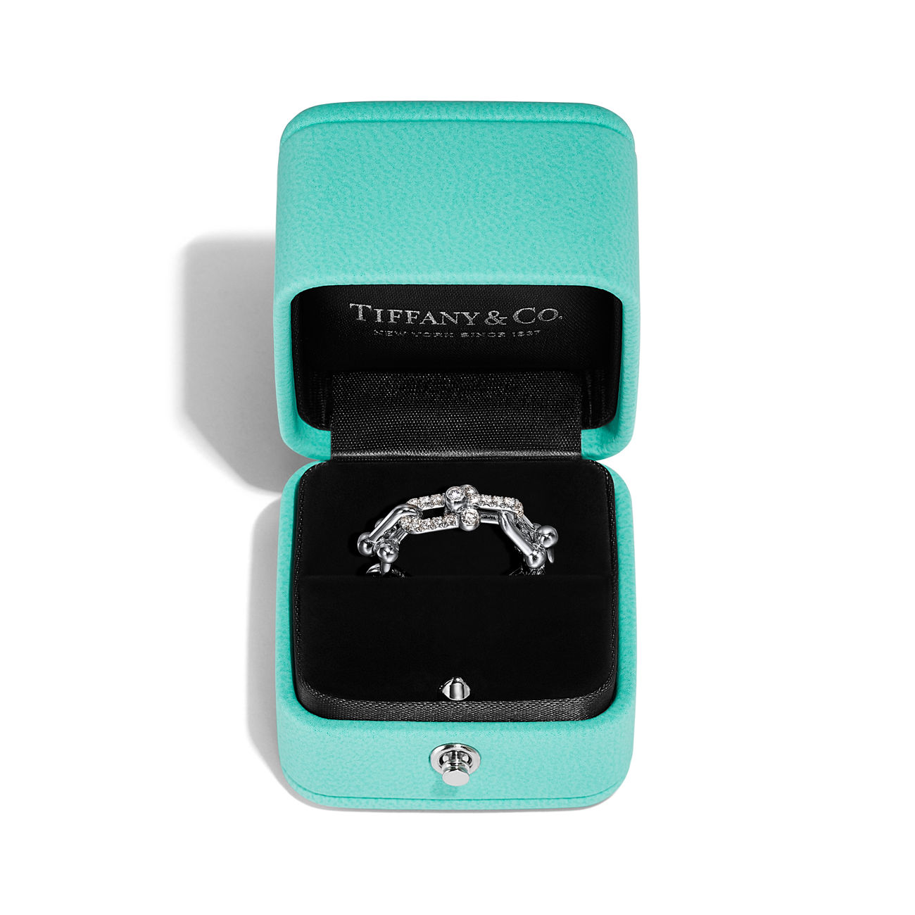Tiffany hardwear is an expression of love’s transformative strength. Inspired by a quintessential bracelet from 1962 found in the house’s archives, hardwear embodies enduring resilience and uninhibited spirit. This 18k rose gold ring features the collection’s signature gauge link design with a striking contrast of metal and diamonds. Tiffany artisans carefully hand set each diamond to achieve maximum shine. It makes a beautiful statement worn on its own or mixed with other metals.