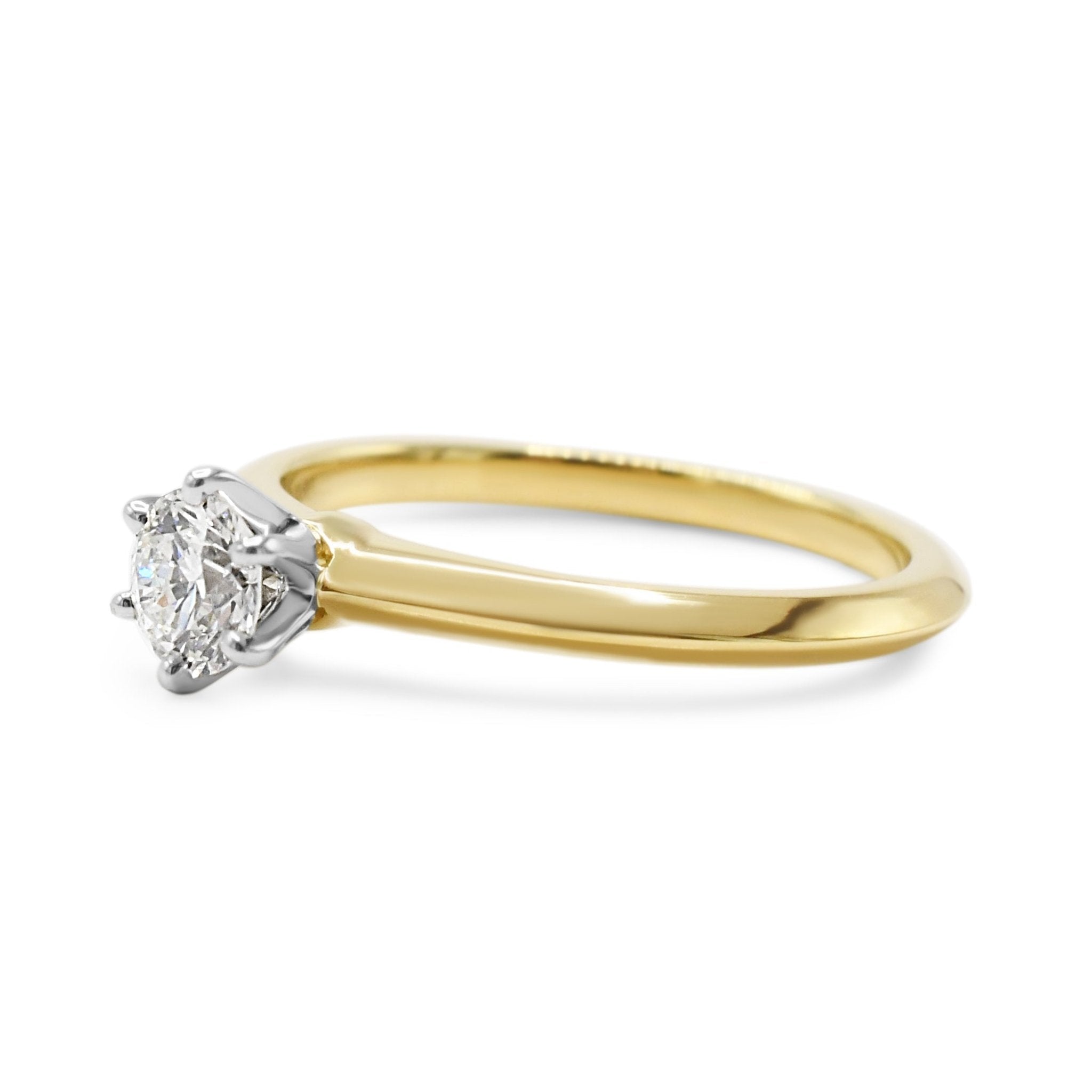 Ladies, get ready to shine and make a statement with this exquisite second hand Tiffany Certificated Solitaire Diamond Ring - 18ct Yellow Gold. This ring is not just any ordinary piece of jewellery, it is a representation of luxury, elegance, and sophistication.