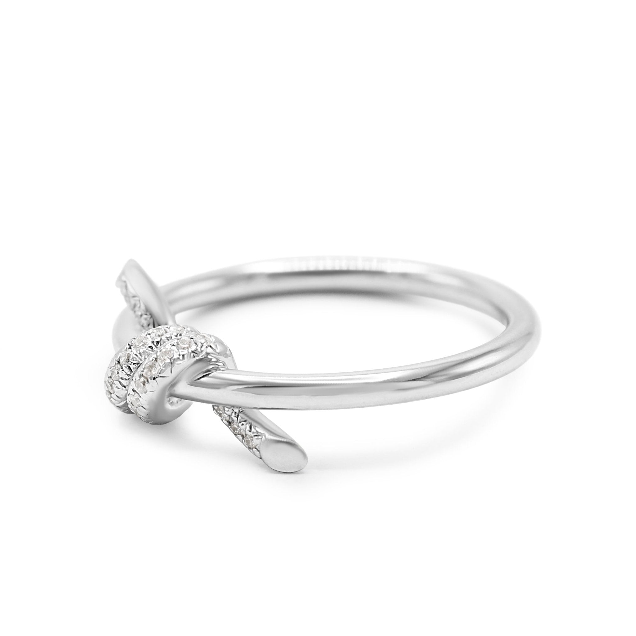 Introducing the perfect blend of elegance and sophistication - this second hand Tiffany Diamond Knot Ring. Crafted by the renowned brand Tiffany & Co, this ring is a mesmerizing masterpiece that exudes grace and luxury.