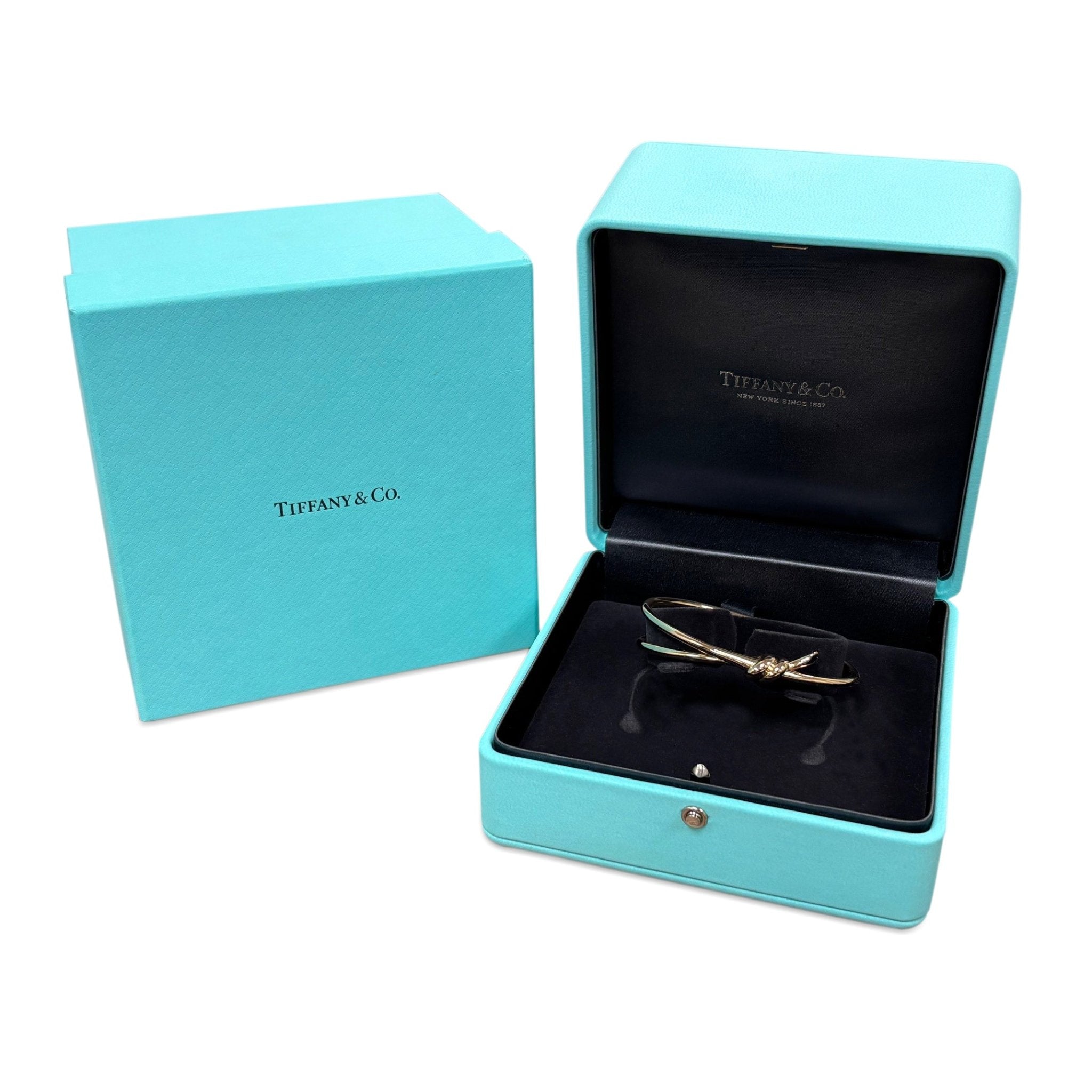 This pre-owned bracelet exudes the timeless charm that Tiffany & Co is known for. The double row of Rose Gold entwines in a graceful knot, symbolizing the strong bond of love and commitment. With its hinged design, this used bangle is not only a statement piece, but also comfortable and practical to wear.