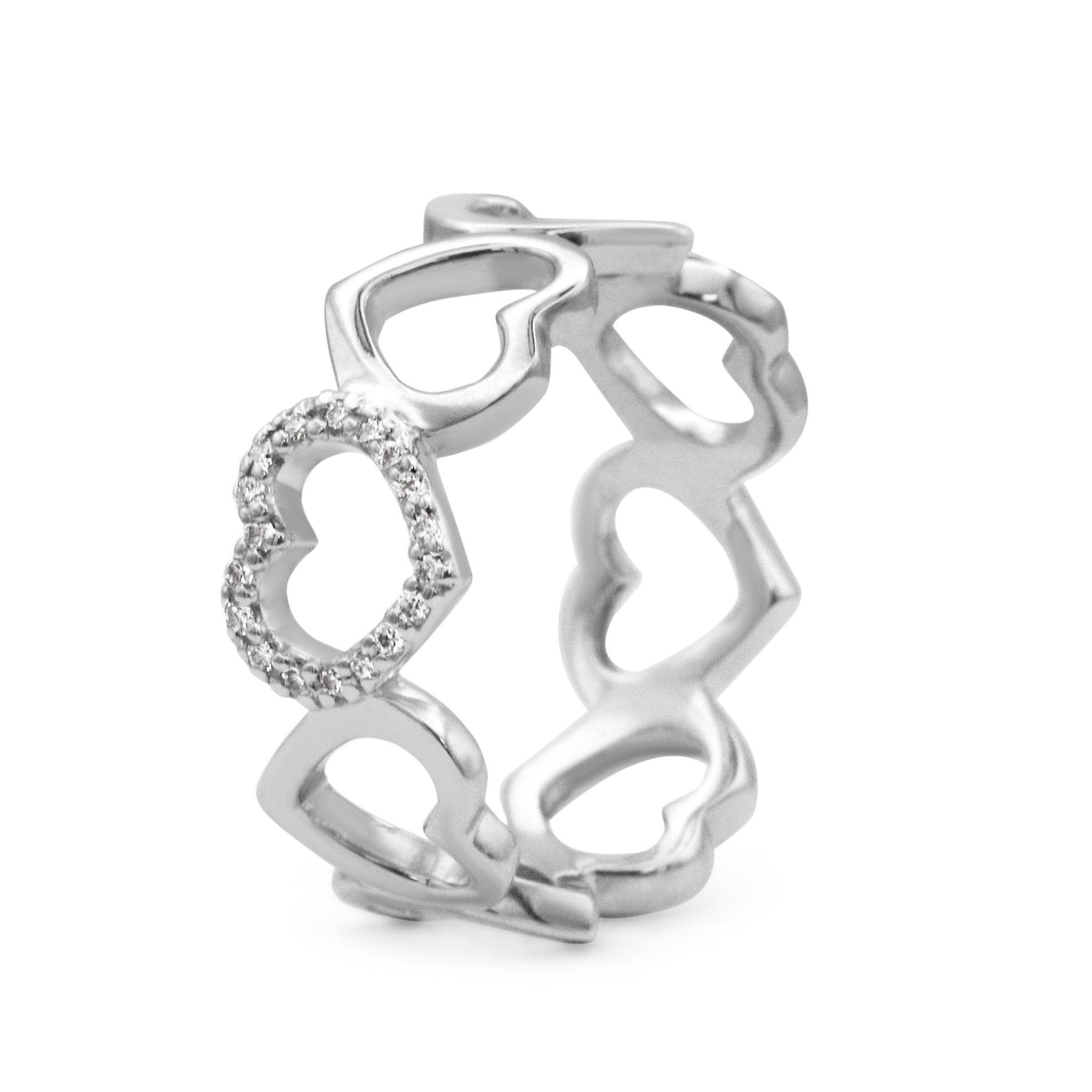 The focal point of this ring is the beautiful open heart design, symbolizing a timeless love that is open and free. The heart is adorned with sparkling round brilliant Diamonds, adding a touch of glamour and sophistication to the ring. This lightweight ring weighs 3.68 grams and set with a total diamond weight of 0.09ct, the Diamonds are of exceptional quality with a colour grade of F-G and a clarity of VS.