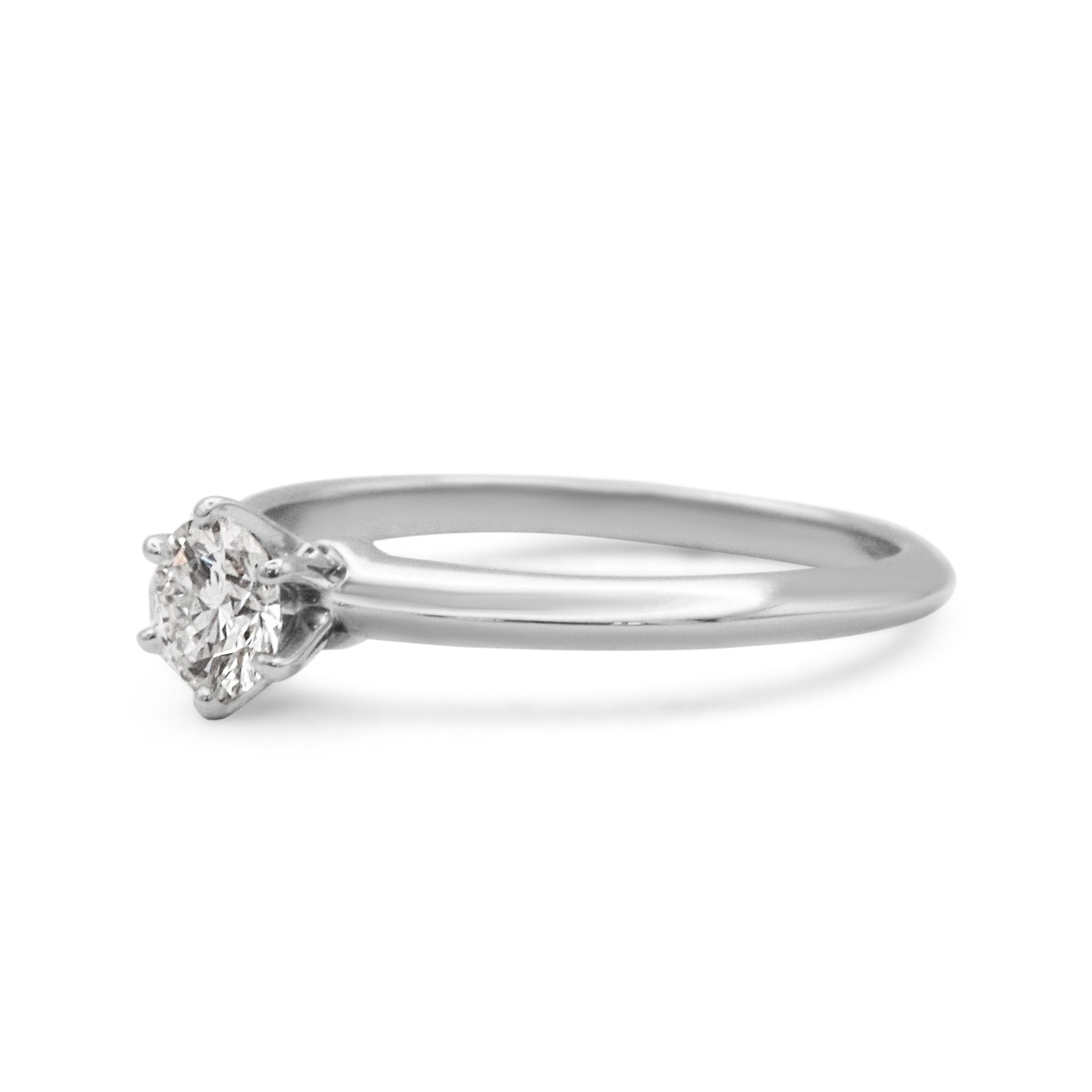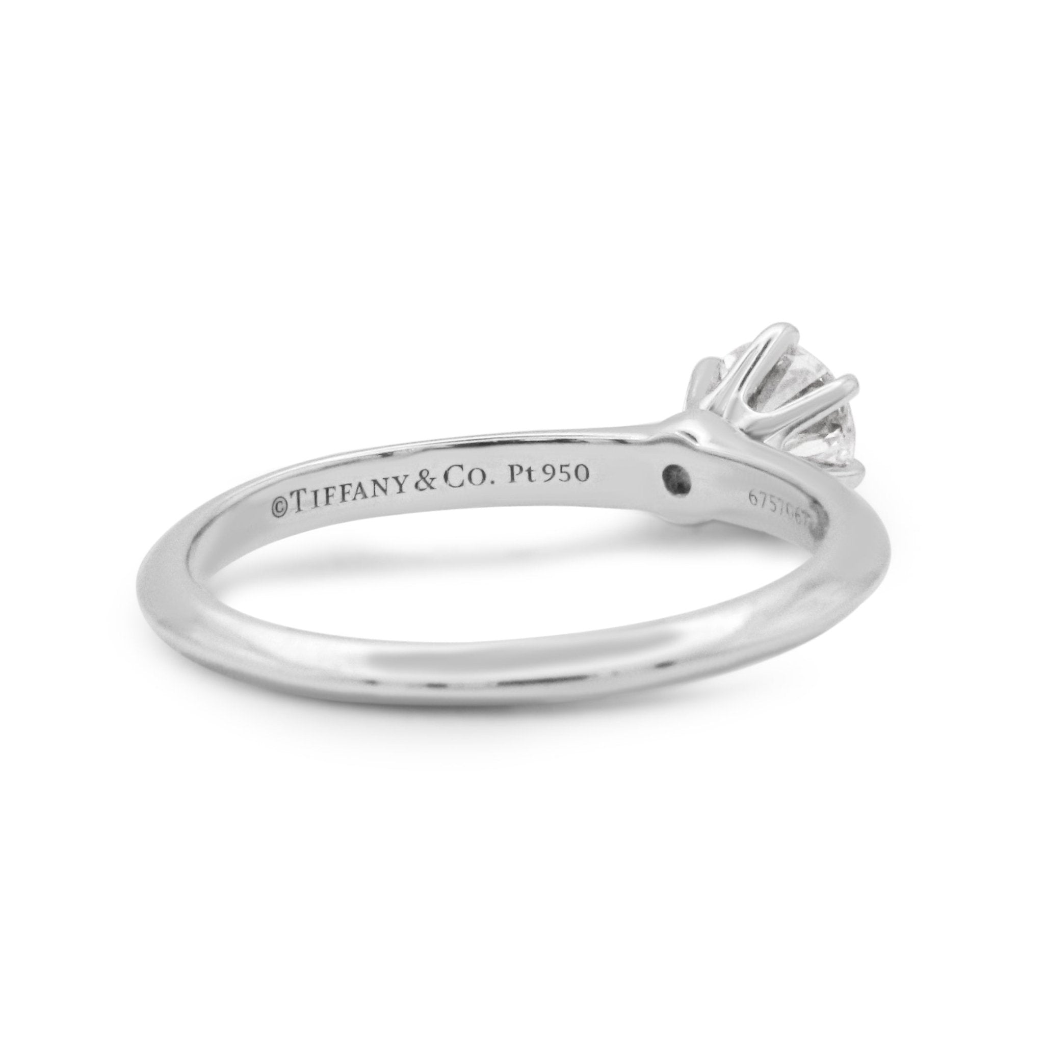 Indulge in the ultimate symbol of love and luxury with this second hand Tiffany & Co. Solitaire 0.45ct Diamond Ring in Platinum. This exquisite piece is crafted by one of the most renowned and coveted brands in the world, Tiffany & Co. Known for their impeccable quality and iconic designs, this ring is a true testament to their unrivalled craftsmanship.