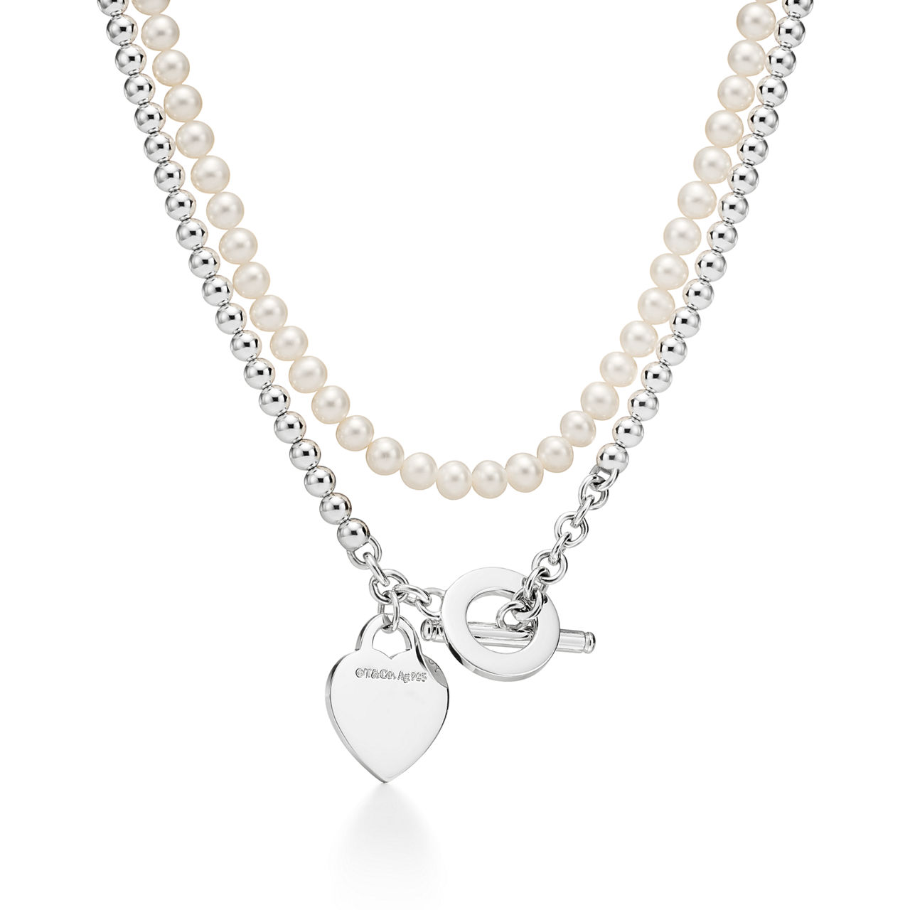 Inspired by a key ring we debuted in 1969, the return to tiffany collection is famous for its signature motif. This meticulously crafted wrap necklace features a striking combination of sterling silver beads and freshwater pearls. The iconic small heart tag is set with a round brilliant diamond. Wear this necklace on its own or style it among your favorites for an unexpected look.